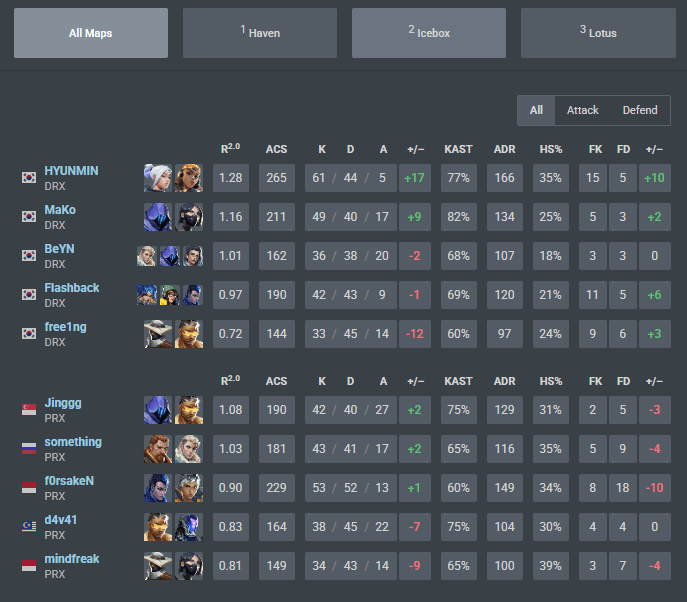 f0rsakeN for Paper Rex, picked up the solo Duelist, however, after years of flex, he didn’t look as comfortable whilst going 8/18 in First Kills/First Deaths. Whereas, HYUNMIN on the winning side, went 15/5 in First Kills/ First Deaths showing the natural Duelist role is more about the entry kills you can gain as a solo Duelist.