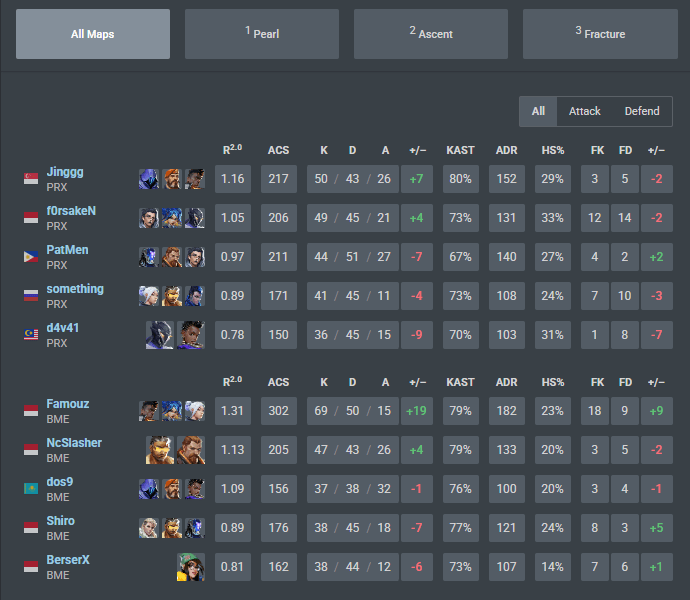 Famouz topped the scoreboard in this series with an impressive 69 frags across the three maps. The best on Paper Rex was Jinggg who has recently moved over to the controller role.