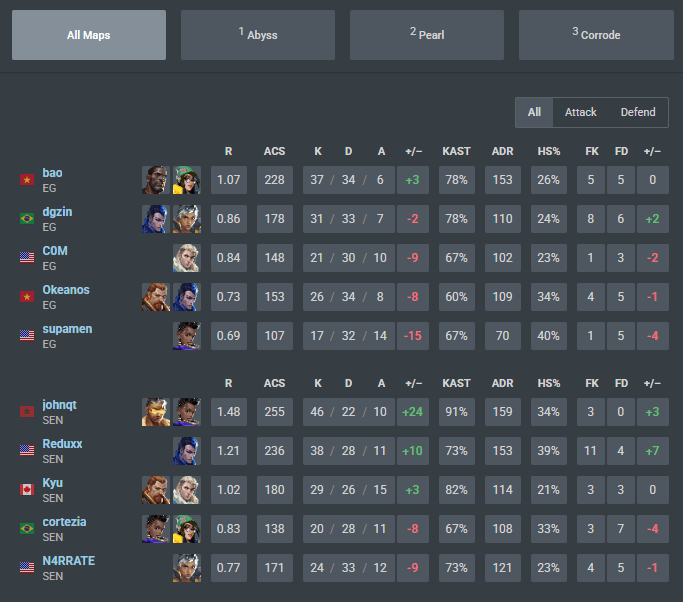 The first map took stage on Abyss, where SEN took a strong start to their attack half with their Double Dive Duelist composition alongside the double Initiator allowing for dominance of the map and complete control when taking the sites. They ended the first half 9-3 with their calm and composed look on the map. They then closed out the map 13-8 with Evil Geniuses not being allowed a step into the series despite some hero plays from bao.