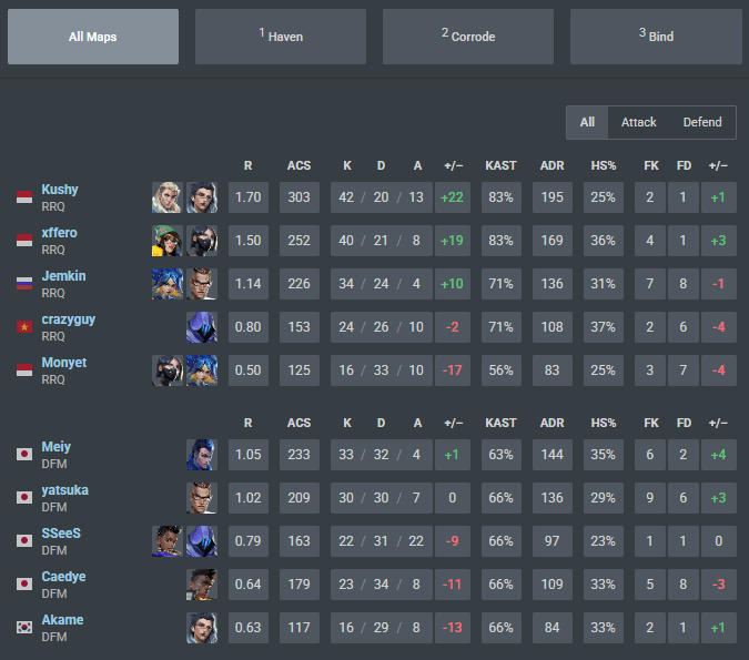 Map 2 went to Corrode, where RRQ carried their momentum taking the first 10 rounds, meaning that RRQ won 19 rounds in a row against the Japanese side. DFM did fight back however, winning the final 2 of the half, ending their attack half 10-2. This however, seemed too much of a hill to climb back for DFM.