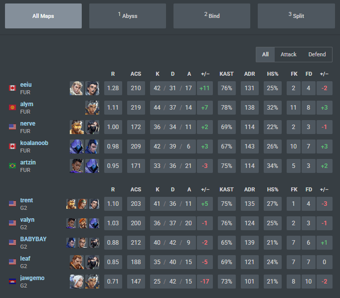 Map one for this series went to Abyss, where FURIA opted for a single duelist composition, where alym was backed up by a double initiator, double controller, allowing him freedom to take space and dominate the map. G2, on the other hand, went to a double duelist comp with JAWGEMO returning to Jett and BABYBAY going to Yoru.