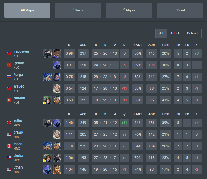 Map 2 took to Abyss, where Xi Lai Gaming leaned towards a Double Duelist, Double Controller composition, whilst NRG relied on their Double Initiator, Double Controller Composition, where their players are most comfortable including 2x Champions winning Initiator Ethan, and Champions MVP Initiator brawk.